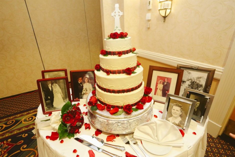Our cake had four tiers, each with a different flavor. The cake was decorated with a Celtic cross, red roses and with the tartan ribbon from Bryon’s Scottish clan. There were weddings pictures of our parents and Bryon’s grandparents. No wedding pictures of my grandparents exist so there were pictures from my grandparents younger days.