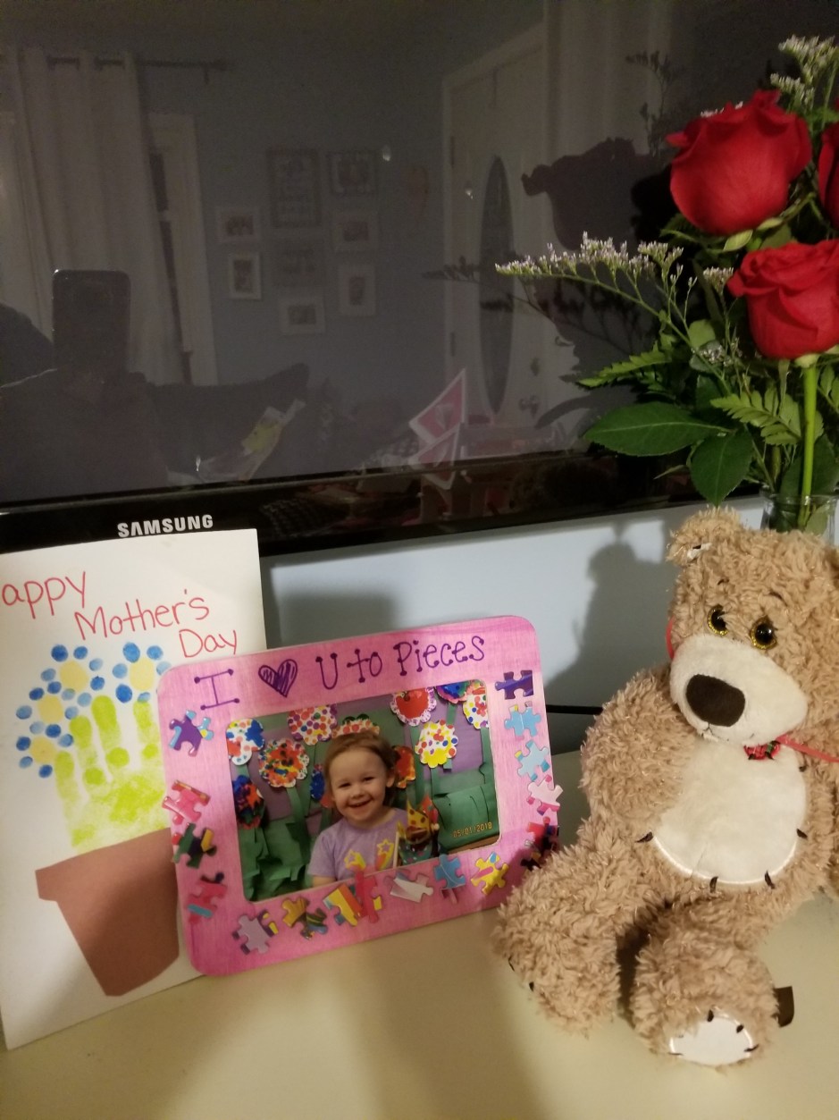 My daughter made the picture and cards at school and my parents sent the flowers and the teddy bear. Though my daughter has already claimed the teddy bear as hers. I had a feeling that they had that in mind when they ordered it…